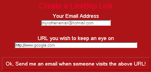 3. Now go to LinkBlip and fill out required information(see the screenshots below). With LinkBlip you send a link and get notified someone has clicked on it. Note that you put an other email address in the first field as in the second one anything on the URL you want(e.g. http://www.google.com) and press the button "OK". Now you’ll get a link something like this (http://lburl.com/xxxxx) from LinkBlip.